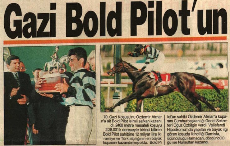 Sahibi Özdemir Atman’ın “Merkez Bankası'nı verseler satmam” dediği Bold Pilot, 1996 senesinde Enternasyonel Boğaziçi Koşusu’nu da birincilikle tamamlayarak muhteşem bir başarıya imza atıyor. 16 Ağustos 1998’de, Başbakanlık Koşusu’nda kazandığı şampiyonlukla hipodromlara veda eden ve yarışseverlerin büyük bir sevgi duyduğu Bold Pilot için, 2013 yılında bir jübile töreni düzenleniyor. 15 senenin ardından haradan çıkarılarak yapılan bu jübile, Türkiye’de bir at için düzenlenen ilk ve tek jübile olarak tarihe geçiyor. 30 Nisan 2015 tarihinde, 22 yaşındayken hayata veda eden bu efsane yarış atı, arkasında kendi neslinden 11 şampiyon yarış atı bırakıyor.